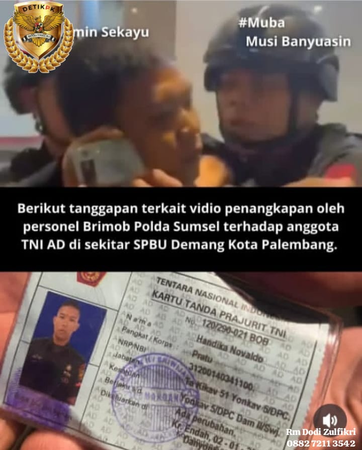 Kodam II/Sriwijaya memberikan klarifikasi terkait kesalahan penangkapan kepada salah satu anggotanya, atas nama Pratu Handika Novaldo NRP 31200140341100, oleh personel Brimob Polda Sumatera Selatan di depan SPBU Hotel Amaris, Minggu dini hari (31/8/2025).
