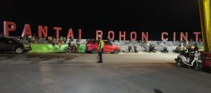 Petugas Satlantas melaksanakan kegiatan patroli dan pengaturan arus lalu lintas di kawasan Simpang Tiga Pantai Pohon Cinta, yang merupakan salah satu titik keramaian di wilayah tersebut.