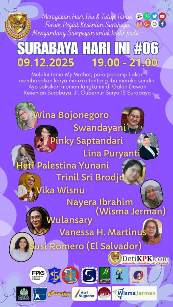 Surabaya – Detikpk.com. 08/12/2025. Sebelas perempuan hebat dari berbagai disiplin akan merayakan Hari Ibu sekaligus menutup tahun pada acara Surabaya Hari Ini #06 yang digelar Forum Pegiat Kesenian Surabaya (FPKS) pada 09 Desember 2025, di Galeri Dewan Kesenian Surabaya, Kompleks Balai Pemuda, Jl. Gubernur Suryo No 15 Surabaya.